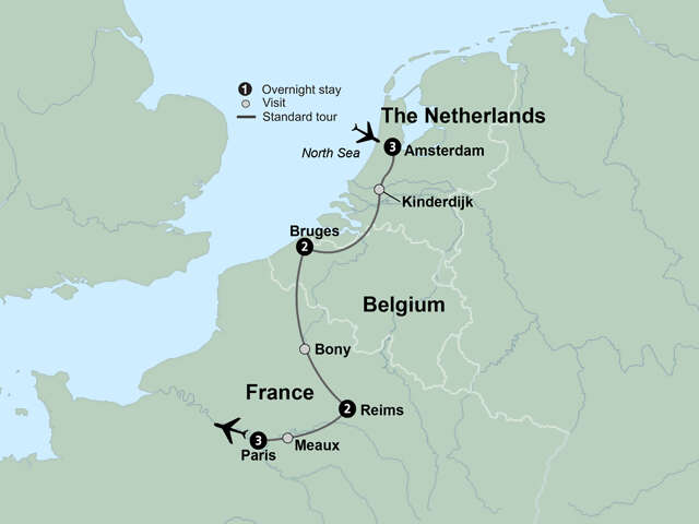 From iconic Dutch windmills and cozy Belgian streets to the world-renowned Champagne region and the “City of Light,” experience the essence of three European countries. Connect with deeply rooted cultures as you make your way through the Netherlands, Belgium, and France.