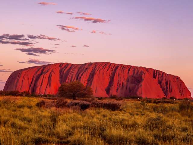 Fly from Adelaide to the spiritual heart of the Outback — Uluru. Upon arrival, travel into Uluru-Kata Tjuta National Park, where the iconic red monolith rises dramatically from the flat desert landscape. On a guided tour of Uluru's base, uncover the stories, traditions, and deep cultural significance of this site through the lens of Australia's Aboriginal people. As the sun begins to set, sip drinks and savor canapés while the colors of Uluru change before your eyes.