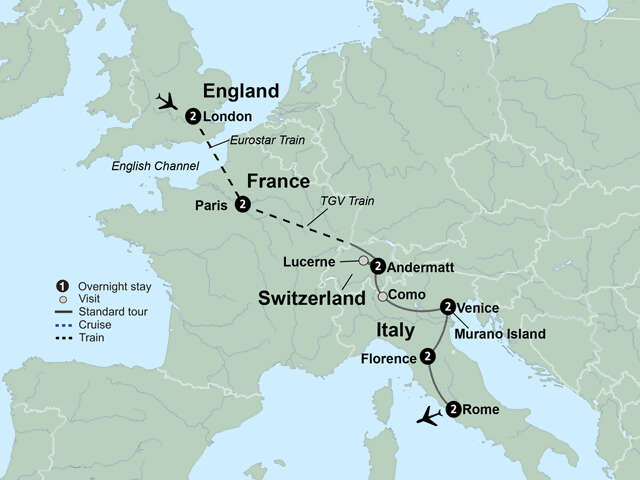 Set your sights on the European journey of a lifetime and discover all the must-sees of England, France, Switzerland, and Italy. See the incredible sights of London, from Buckingham Palace to Big Ben. Take the Eurostar train to Paris and personalize your stay by touring the “City of Lights” on a relaxed panoramic drive or on a walking tour of the hilltop Montmartre district. Take in breathtaking views from your dinner table aboard a Parisian riverboat. Board a high-speed train bound for Lucerne, the enchanting Swiss city on a cobalt lake and one of Switzerland’s most beautiful places. In Venice, discover a floating city where iconic landmarks of centuries-old history line canals dotted with gondolas. Tour Florence, the “Cradle of the Renaissance.” Finally, in Rome, bask in cultural treasures and envelop yourself in the history of the “Eternal City,” which includes a visit to the Sistine Chapel. Storied history, mouthwatering cuisine, and iconic landscapes await.