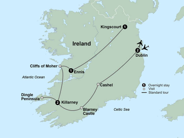 Dublin - KillarneyDepart Dublin for Ireland’s breathtaking countryside. Visit the town of Cashel for views of the historic Rock of Cashel, the location where it’s believed St. Patrick preached and converted the king of Munster. Next, journey to historic Blarney Castle, where you may take the opportunity to kiss the famous Blarney Stone. Legend has it that those who kiss the stone are bestowed with the gift of eloquence. End your day in Killarney, a town surrounded by natural beauty. Enjoy dinner this evening at a local restaurant. Meal included: Breakfast & DinnerAccommodation: Old Ground Hotel