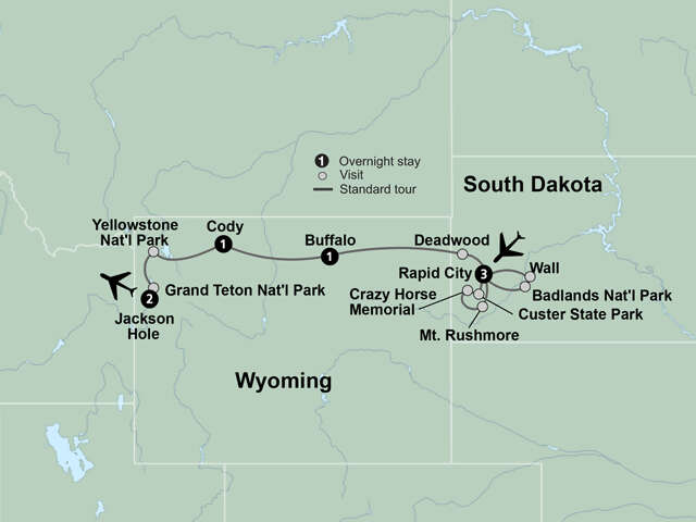Enjoy stunning views of the American West as you make your way through Yellowstone, Grand Teton National Park, and more. Overnight in the cowboy towns of Jackson Hole and Cody. Experience the Wild West as it once was with a visit to Deadwood, a town built on gold and gunpowder. Choose how you delve into the local history, with a tour of the Adams Museum in Deadwood or at the exhibit Tatanka: Story of the Bison. Experience Yellowstone National Park, home to an incredible array of wildlife. Search for free-ranging herds of buffalo in Custer State Park. Marvel at Grand Teton National Park’s towering peaks, marked with mountain glaciers. Soak in stunning views of Mt. Rushmore and the Crazy Horse Memorials. Grab your Stetson hat and saddle up for an adventure as you discover natural wonders and cultural treasures.