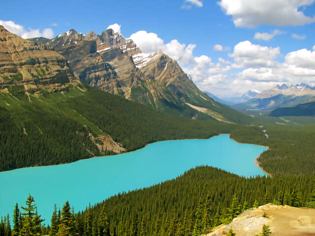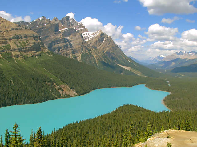 Set out along the unforgettable Icefields Parkway and behold lofty waterfalls, rushing rivers, glacial peaks, imposing cliffs, and snowcapped mountain ranges. Stop at the Athabasca Glacier where it’s your choice! Choose a fun ride** across this mass of glacial ice nearly 1,000 feet thick, the largest accumulation of ice south of the Arctic Circle -OR- take a walk onto a glass-bottom platform at the Columbia Icefield Skywalk to experience the breathtaking views of the Sunwapta Valley and witness the dramatic landscape. This afternoon, stop at stunning Peyto Lake, a glacier-fed lake that evokes pure serenity. Be on the lookout for bears and stately elk on your return to Banff.