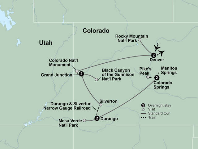 Durango - Colorado SpringsSit back and relax during a scenic ride to Colorado Springs. En route, marvel at the landscape as you make your way from the San Juan National Forest and across Wolf Creek Pass, a section of the Continental Divide that would take pioneers two to three weeks to cross. Continue on through the Rio Grande National Forest, a vast expanse of wilderness named for the 1,800 miles of Rio Grande River that cuts through the forest. Your day concludes in Colorado Springs, an artistic and cultural hub. Meal included: BreakfastAccommodation: Embassy Suites by Hilton