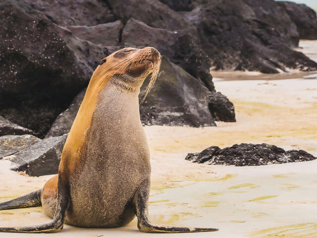 A dry landing on Española Island, one of the oldest and most isolated in the Galápagos, offers an unparalleled variety of wildlife. Explore volcanic formations and see large colonies of sea lions and seabirds including the Española mockingbird, Nazca boobies, and the spectacular red-billed tropicbirds. On Española, turquoise-colored marine iguanas, lava lizards, and the colorful Sally light-foot crabs abound. A hike brings you to nesting grounds where you may spot favorites such as the Galápagos dove, the Galápagos hawk, swallow-tailed gulls and the world’s largest colony of waved albatross - a true highlight! Admire the island’s dramatic backdrop and famous “Soplador,” a blowhole that shoots water 75 feet into the air. This afternoon a wet landing on a beautiful white coral sandy beach guarded by a colony of sea lions offers the opportunity to spot Galápagos hawks, American Oystercatchers, Galápagos Ground Doves, Hood mockingbirds, Yellow Warblers, lava lizards, marine iguanas, and three species of Darwin’s finches. Swim and snorkel among the Galápagos’ marine wildlife such as king angelfish, Creole fish, damsel fish, parrotfish, manta rays, and white-tipped reef sharks.