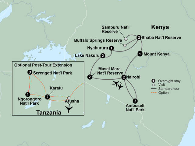 Enjoy Kenya's scenic vistas and magnificent wildlife as you traverse the African plains on an intimate safari adventure. In Swahili, “safari” means journey; to you, it will mean that - and so much more. Explore Kenya, home to incredible wildlife, from cheetahs to wildebeests. Discover the thriving cultures and innumerable natural wonders that make this one of the most popular African countries to visit. Go in search of elephants, lions, buffalo, rhinos, and leopards - collectively known as the “Big 5” and other animals on 13 game drives. Meet a member of the Samburu tribe who opens you up to the culture, folklore, and African traditions. Visit with Rothschild giraffes at the Giraffe Sanctuary. Visit the beautiful Maasai Mara National Reserve, and top off a full day game drive with a traditional dinner in the bush and a Maasai dance performance. These are the plains of Africa, where unparalleled experiences greet you at every turn.