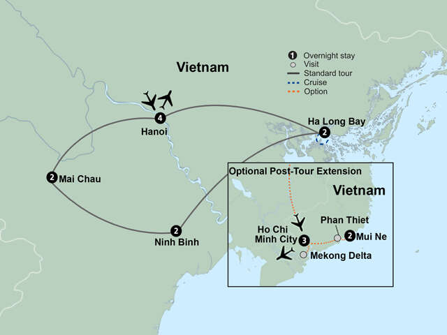 Your journey begins with an overnight flight to Northern Vietnam. From the peaceful rice paddies of Mai Chau to the towering limestone peaks rising from the waters of Ha Long Bay, and from the warm-hearted locals of Ninh Binh to the vibrant pulse of Hanoi, prepare for a cultural adventure.