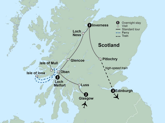 Glasgow - Luss - Oban - Loch MelfortLeave the city behind, traveling along sloping fields towards Loch Lomond. Visit a family-run farm with spectacular views of the lake and surrounding hills, see border collies in action during a traditional sheepdog demonstration, and enjoy Scottish snacks. Next, arrive in Luss and explore this quaint lakeside village of stone cottages and bright flowers, taking time for lunch on your own. Then, it’s off to Oban, where a local guide will lead you on a walking tour of this coastal town and important fishing port. Continue to Loch Melfort and settle into your hotel for the next two nights. Take in a stunning view of the ocean from the hotel before wandering the grounds, home to friendly Highland cows and neighboring the National Trust’s Arduaine Gardens. Meal included: Breakfast & DinnerAccommodation: Best Western Palace Hotel