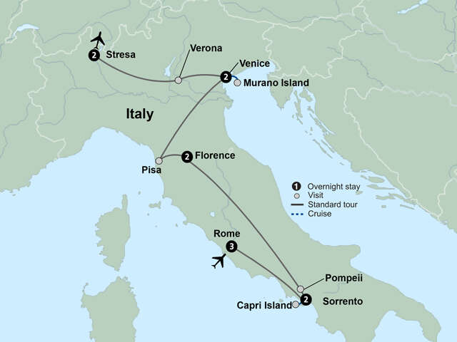 From the ancient ruins of Pompeii to the chic charm of the Isle of Capri, embark on a spectacular Italian getaway. Enjoy multiple-night stays in Rome, the charming Sorrento Coast, Florence, Venice, and Stresa in the Lake District. Discover the treasures of Classical Rome, including the Colosseum. Walk in the footsteps of the ancient Romans in Pompeii. Take a boat to the enchanting Isle of Capri. See the gems of the Renaissance in Florence, a veritable open-air museum. Marvel at the Leaning Tower of Pisa and stroll the streets of Verona. Stop at a Tuscan winery and farm for a lunch of regional specialties and wines. Tour Venice and walk the Castello district. Cruise to Isola Pescatori, one of the scenic Borromean Islands. Delve deeper into its history and culture as you visit some of the world’s most beautiful locales.