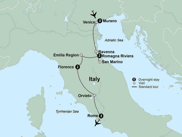 Overnight FlightFrom the romantic canals of Venice to the Renaissance treasures of Florence and timeless allure of Rome, get ready for an Italian adventure. Along the way, you’ll unwind on the Romagna Riviera and visit the Republic of San Marino, an enclave surrounded by Italy. Embrace the history, culture, art, and romance of Italy. Accommodation: Hyatt Centric Murano