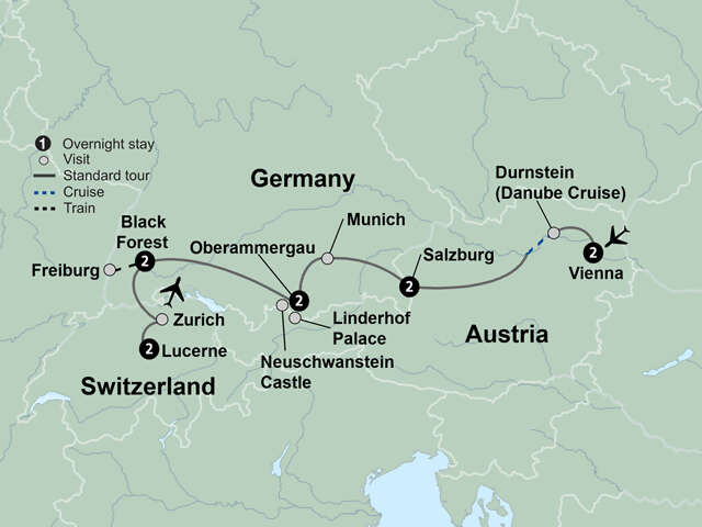 Discover storybook castles and opulent palaces amidst stunning Alpine vistas as you explore Austria, Germany, and Switzerland. Visit Schönbrunn Palace in Vienna. Take a cruise along the legendary Danube. Stroll the quaint streets of Salzburg, the "City of Music." Spend two nights in the heart of the Black Forest. Visit Oberammergau, renowned for its 380-year tradition of producing a Passion Play every decade. Witness the beauty of Linderhof Palace and its perfectly decorated gardens. From Vienna and the Black Forest to the Swiss Alps and Lucerne, explore the heart of Europe.
