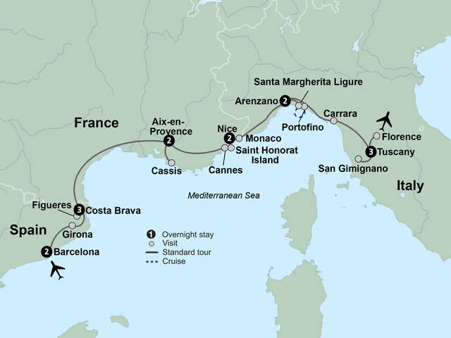 Venture along the glittering Mediterranean coast on an immersive journey through the Spanish, French, and Italian Rivieras. Discover the medieval charm of Besalú and the vibrant history of Girona, where cobbled streets and ancient walls whisper stories of the past. Marvel at the dramatic cliffs and hidden coves of the Costa Brava. Cruise along the coves of Cassis and the breathtaking Calanques, where limestone cliffs plunge into turquoise waters. Experience the heart of the Côte d’Azur in Nice, the elegance of Aix-en-Provence, and the glamour of Monaco and Cannes. In Italy, the journey winds through the vine-covered hills of Tuscany to the Renaissance splendor of Florence. Along the way, meet local winemakers, explore historic estates, and toast to unforgettable views. From chameleonic Barcelona to sun-kissed Nice, and from timeless villages to iconic cities, this is your dream Mediterranean escape.