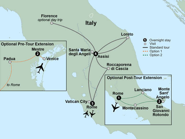 Rome - Santa Maria degli Angeli, AssisiTravel north to the region of Umbria, known as “the green heart of Italy” and where St. Francis spent most of his life. Pause for lunch at a family-owned winery nestled in the countryside. This afternoon, visit the Basilica of St. Mary of the Angels, where you explore the Porziuncola - the small chapel that is the founding site of the Franciscan Order. Stroll through the rose garden, where tradition holds that the miracle of the thorny bush took place. Then pause for a moment of reflection at the Chapel of the Transitus, where St. Francis of Assisi passed away. You’ll have the opportunity to celebrate Mass* at the basilica before checking into your hotel in the early evening. Settle in for a four-night stay before spending an evening at leisure. Meal included: Breakfast & LunchAccommodation: Hotel Cenacolo, Santa Mario degli Angeli
