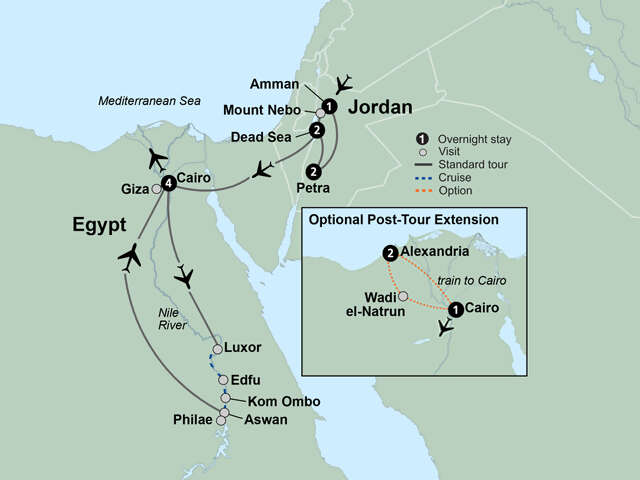 Dead Sea - Fly to Cairo, EgyptPre-dawn this morning,* say goodbye to your Jordanian Tour Manager before boarding a 90-minute flight to Cairo, the capital of Egypt. Arrive in the land of the Pharaohs and meet your Egyptian Tour Manager, who will accompany you for the rest of the trip. Feel Cairo’s constant thrum of energy wrap around you as you transfer to the hotel for a two-night stay. Meal included: Breakfast & DinnerAccommodation: M/S Blue Shadow I, Nile River Cruise